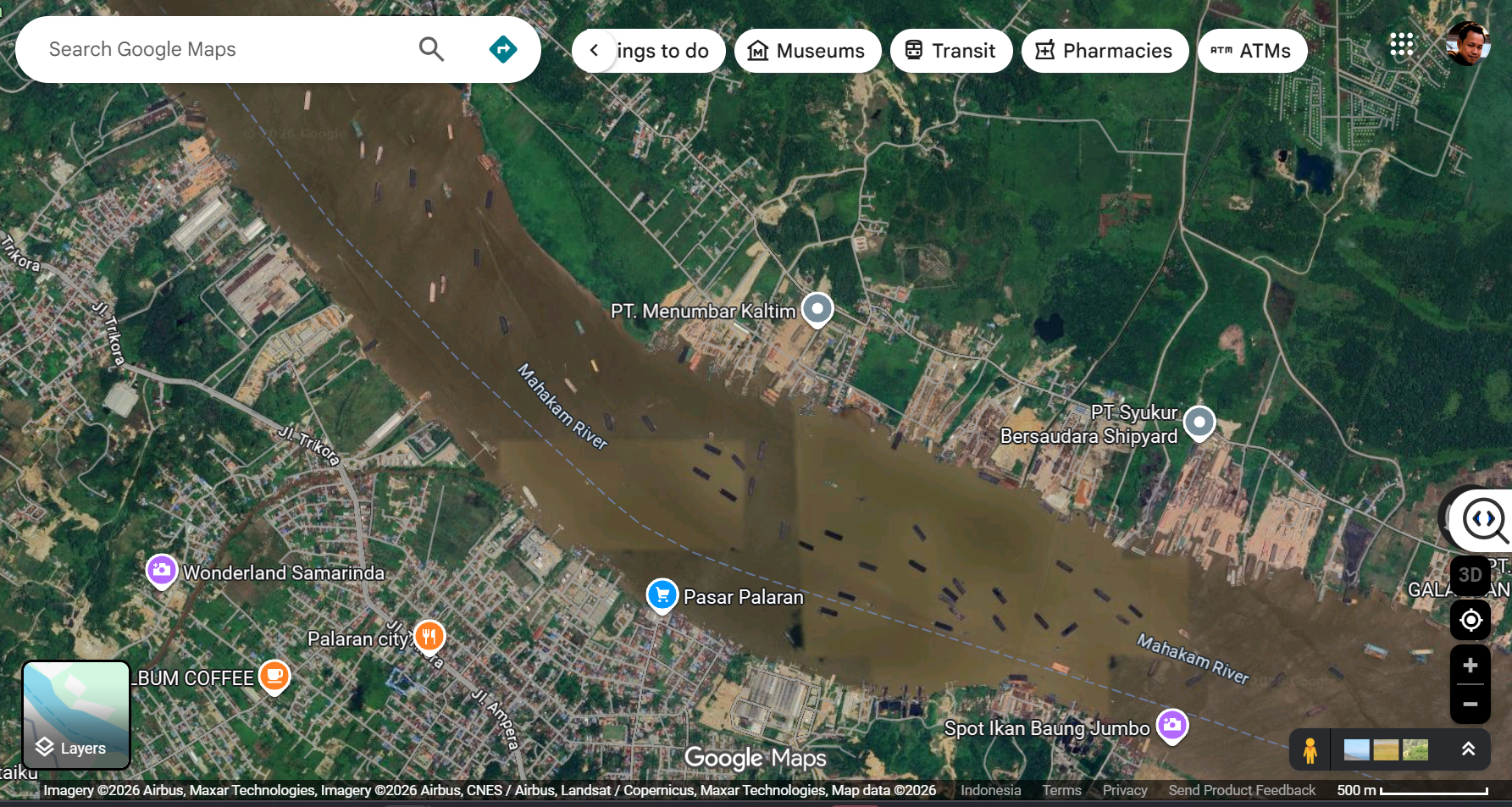 Tangkapan google map dari sungai Mahakam, puluhan tongkang batubara dibawa dari tambang dibagian hilir ke bagian hulu.