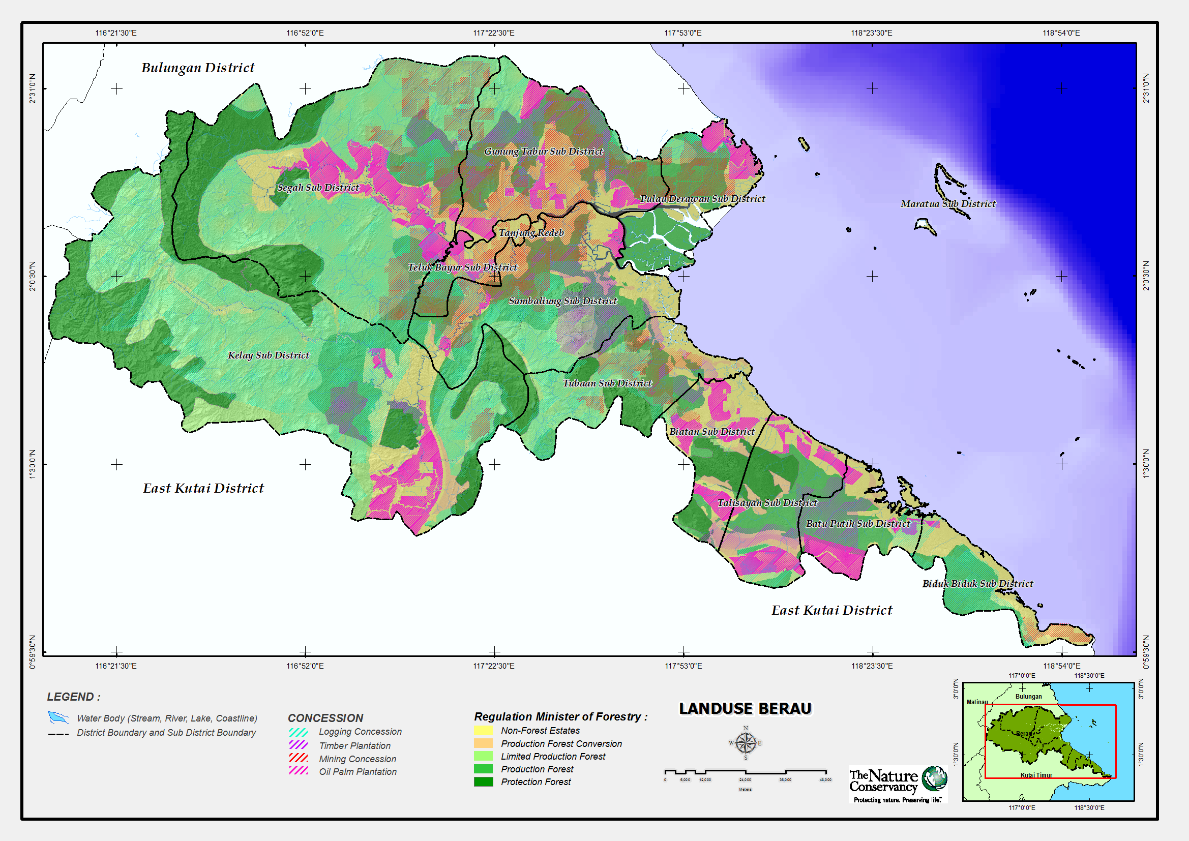 Ada banyak LSM yang bekerja dibidang penguatan data spatial, salah satunya adalah The Nature Conservancy yang bekerja di Kabupaten Berau, Kalimantan Timur. Pendekatan berbasis Jurisdictional Approach yang dilakukan TNC di Berau mencakup aspek-aspek yang luas mulai dari bekerja di tingkat tapak dengan community base natural resource management, pendekatan berbasis site dengan konservasi kawasan karst, pendekatan berbasis sektoral dengan improve forest management dengan perusahaan dengan menerapkan RIL dan mendukung sertifikasi sampai pada pendekatan kebijakan dengan menerapkan prinsip-prinsip pembangunan berkelanjutan. Pada semua aspek dan cakupan tersebut data spatial memiliki peran penting dalam menyusun perencanaan, pelaksanaan sampai pada evaluasi dan monitoring kegiatan.