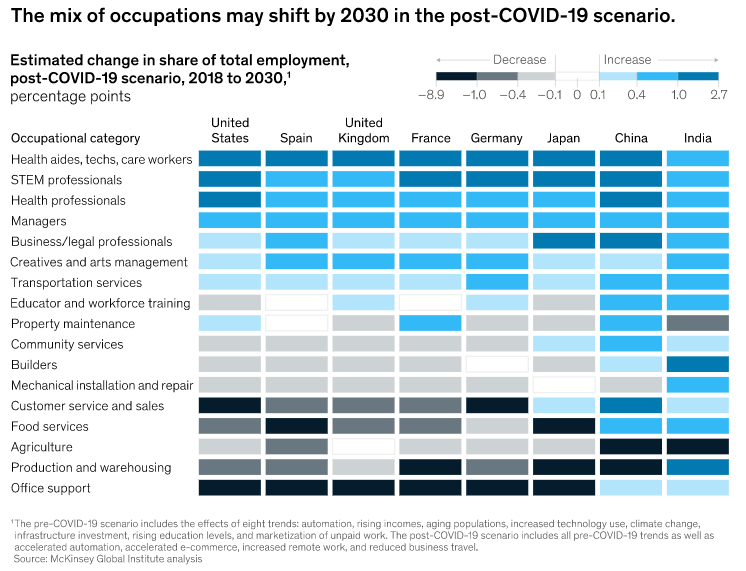 Salah satu tulisan yang menarik yang saya baca adalah tentang masa depan pekerjaan sesudah Covid 19. Disebutkan bahwa beberapa jenis pekerjaan 25% harus beradaptasi dengan situasi Covid 19, terutama bagaimana mengganti pekerjaan yang sifatnya interaksi langsung dengan kegiatan penggantinya. Tulisan juga menyoroti tentang bagaimana Covid 19 mempengaruhi pekerjaan diberbagai sektor seperti terlihat digrafik ini:
