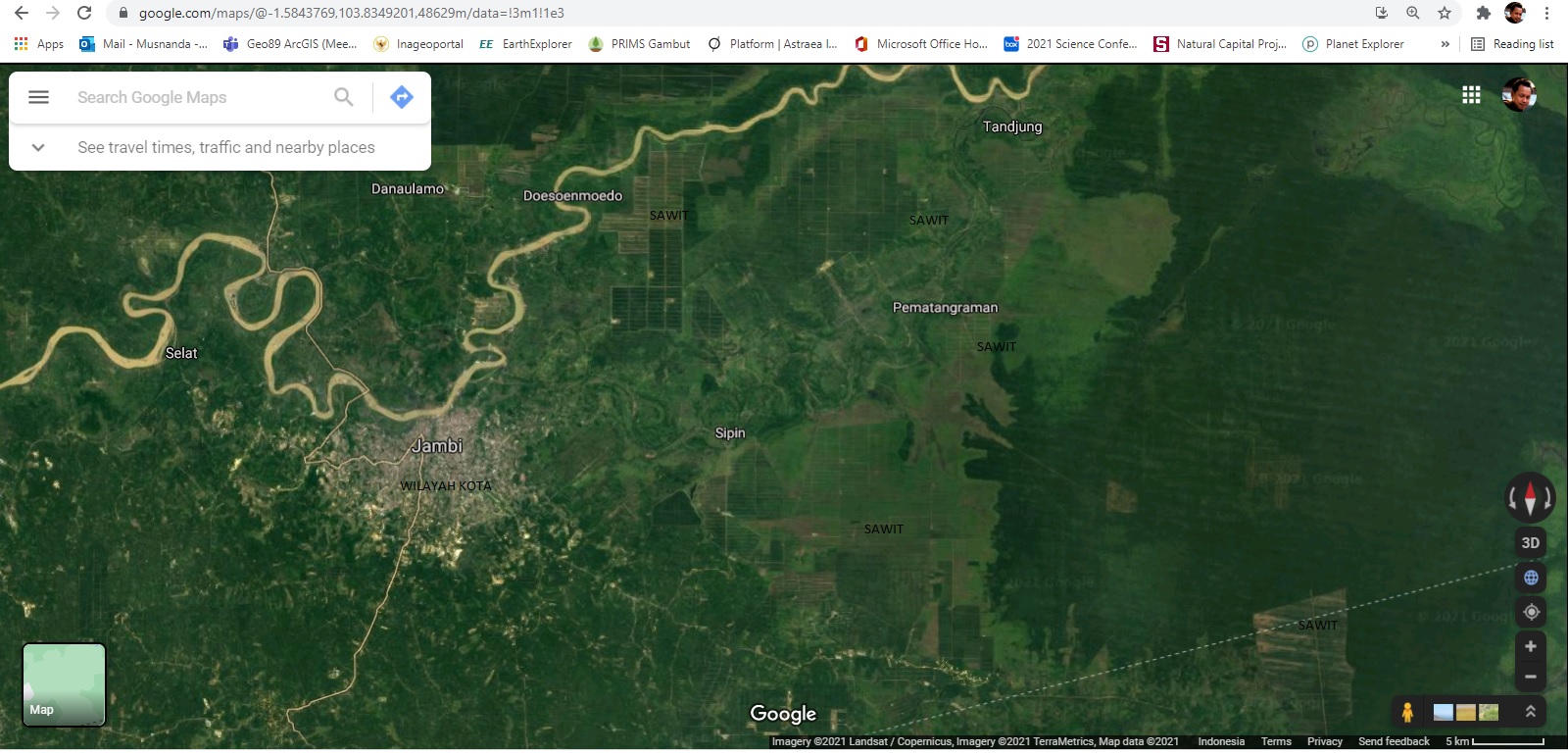 Peta di atas menunjukkan bahwa luas kota Jambi hanya 1/10 dari luas kebun sawit di sekitar-nya.