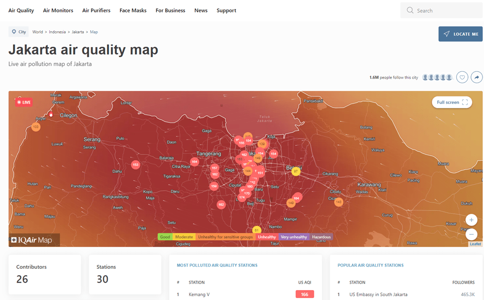 Dari website tersebut kita bisa melihat distribusi kualitas udara di Jakarta atau kota lain secara detail melalui peta yang ditampilkan. Selain itu terdapat informasi pendukung dimana terdapat 27 stasiun pengamatan yang digunakan oleh IQAir dan dimana saat ini kualitas udara Jakarta memiliki nilai 9,6 kali lebih buruk dari standar WHO. Pada kualitas udara saat ini rekomendasi yang diberikan adalah kelompok sensitive sebaiknya menggunakan masker di luar ruangan (ini termasuk anak-anak), mengurangi aktifitas di luar ruangan, menutup jendela untuk menghindari masuknya partikel udara buruk di rumah (terutama juga pada kendaraan) dan jika bisa menggunakan penyaring udara di rumah. Salah satu solusi jangka panjang dapat juga mulai menanam tanaman dipekarangan atau di sekitar rumah. Tanaman mampu menyaring udara sebelum udara masuk kedalam rumah.